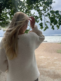 Evi sweater - like a hug from the clouds, luxury for you. Luxuriously soft, hand-knitted merino wool sweater with gorgeous sleeves and a boat neckline. Nice fit that makes the sweater versatile. What's Inside of You? amulet at the back of the neck.