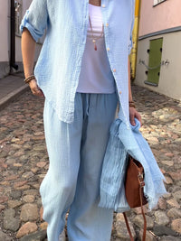Summer favorites! Dreamy soft cotton pants with an elastic waistband and decorative cords. Soft waffle-like cotton. Very good waist height and wide legs. Pocketless model.