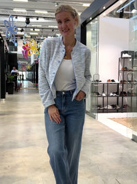 A gorgeous Chanel-inspired jacket in a breathtakingly beautiful color. Snaps at the front, elastic at the waist and back. Long sleeves and elastic at the cuffs. A lined jacket, so this is also great as an outer jacket in spring or cool summer weather. Pair it casually with jeans or wear it as a party jacket. This jacket is suitable for many occasions.