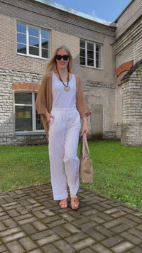 A delightful novelty. A stylish oversize cardigan with bat sleeves and a wonderful holey knit. Open model from the front. This cardigan goes well with linen pants and shorts, or combine with jeans and a top, or try it with a more festive outfit.