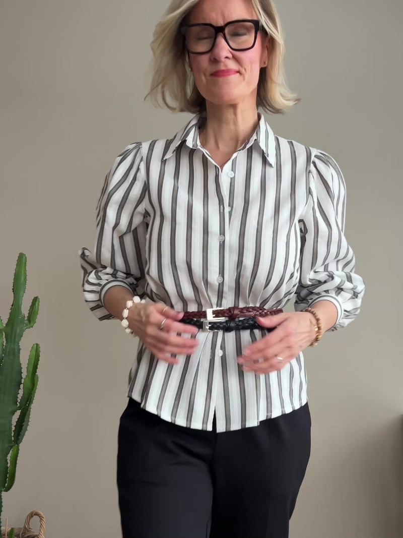 Carita-kauluspaita yhdistää ajattoman eleganssin ja käytännöllisen mukavuuden. Vaalea taupe -sävy sopii moniin tyyleihin ja vaatteisiin. Puuvillasta valmistettu paita tarjoaa hengittävyyttä ja kestävyyttä päivittäiseen käyttöön. Raidallinen kuvio tuo tekstuuria, kun taas puhvihihat ja klassinen kaulus antaa naisellisen vivahteen. Napitus tekee paidasta helposti säädettävän ja monipuolisen. Takana oleva laskos antaa liikkumatilaa.