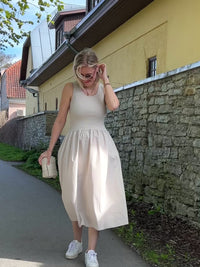 Ihastuttava ja niin monikäyttöinen mekko. Joustava yläosa on miellyttävä päällä, taskut sivusaumoissa antaa kivaa rentoutta ja helma on kauniisti alaspäin levenevä. Tässä mekossa on trendikäs pituus ja mekko sopii täydellisesti tennareiden tai sandaalien kera. Letizia -mekkoon haluat pukeutua yhä uudelleen ja uudelleen.